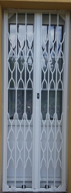 Grille de protcetion articulée pour porte-fenêtre. Manoeuvre facilitée par des roulettes à roulement billes en partie basse.